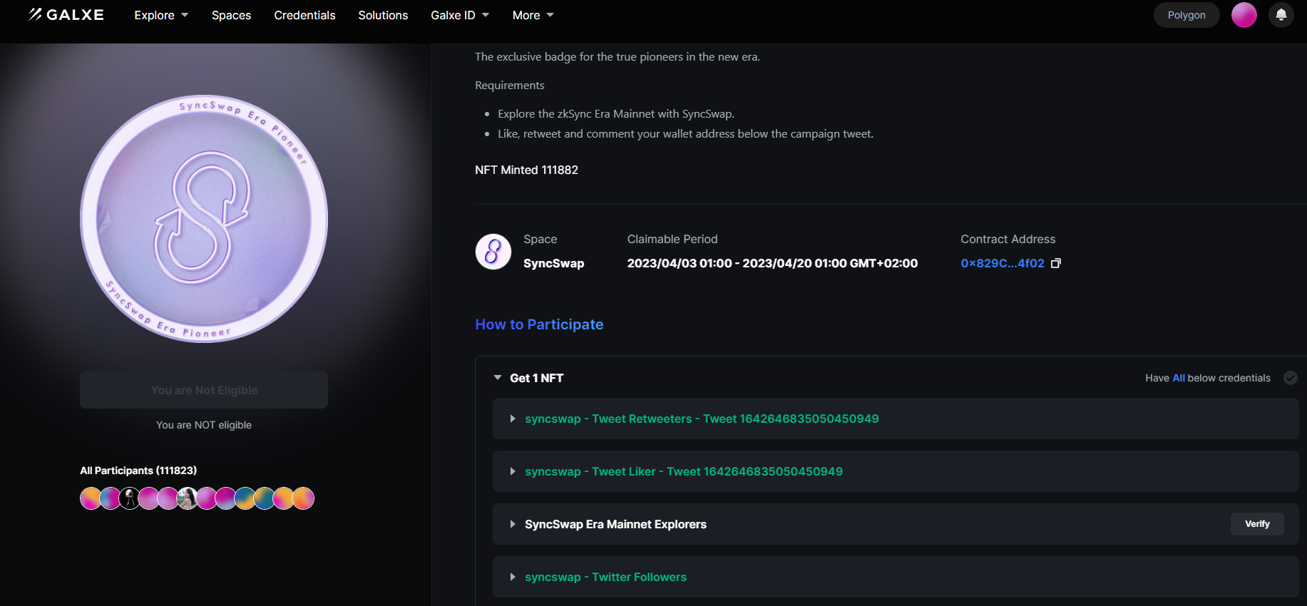 na polygonu taky nic, proste sem na galxe NOT eligible ale nevim proc, nejde mi to varifikovat pritom transakce mam, likviditu taky, retweet, follow i koment s adresou mam
