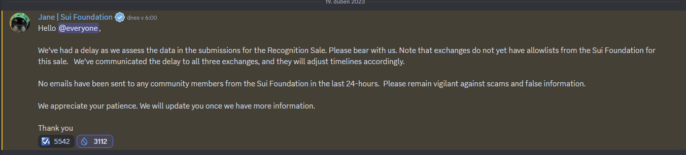 "We can now confirm that exchanges have started receiving allowlists for the 96K randomly selected participants for the Recognition Sale. The Sui Foundation will begin emailing all of the selected participants to inform them of their assigned exchange and instructions regarding next steps.