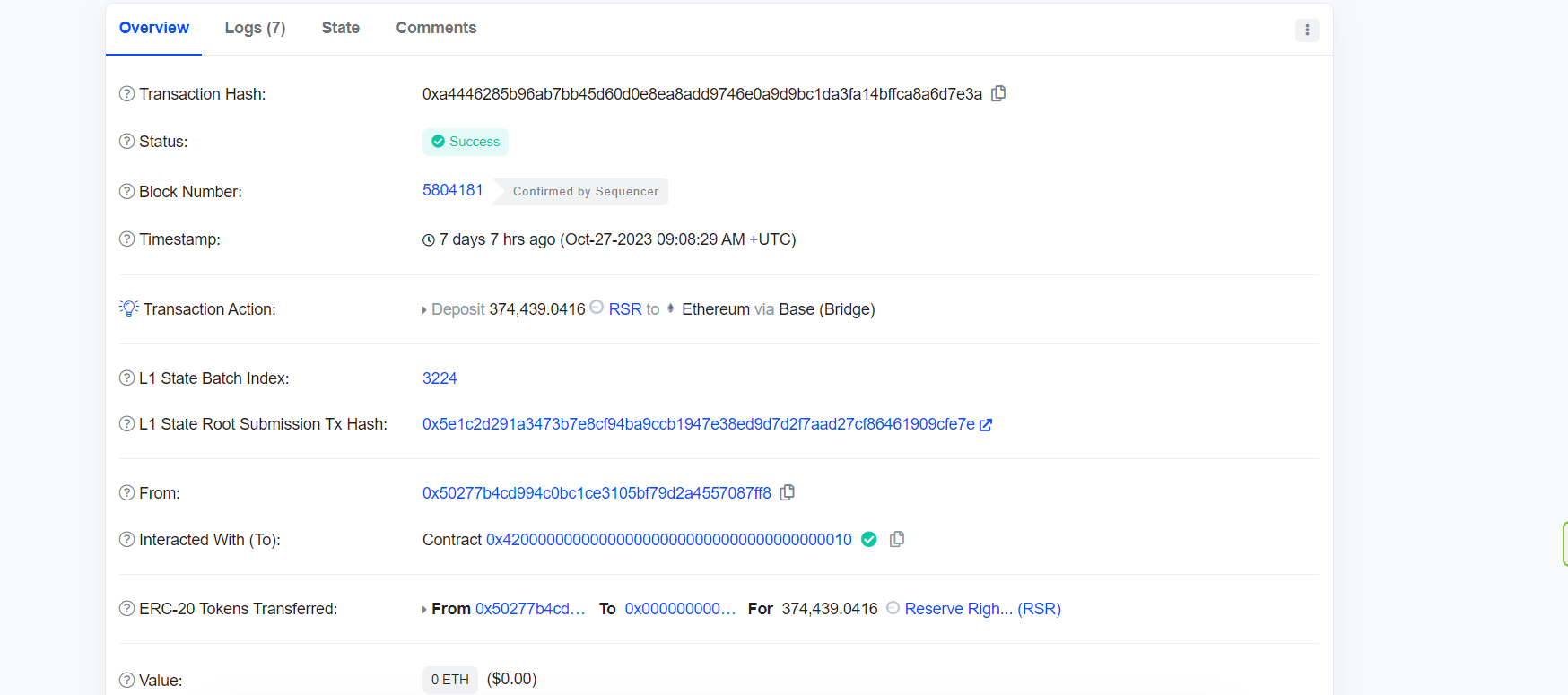 Zdar lidičky opět s prosbou před časem jsem zde dával že my visíí Rsr z neznalosti na Optimismu nakonec tedy moije neznalost že je tobezpečnost Optimismu po čase jsem se šel kouknout zda je to tedy už bidge a už tam nic nejde vidět a tady je ta transakce na Ethereu Rsr ani na Base vidět nejde tak už nevím