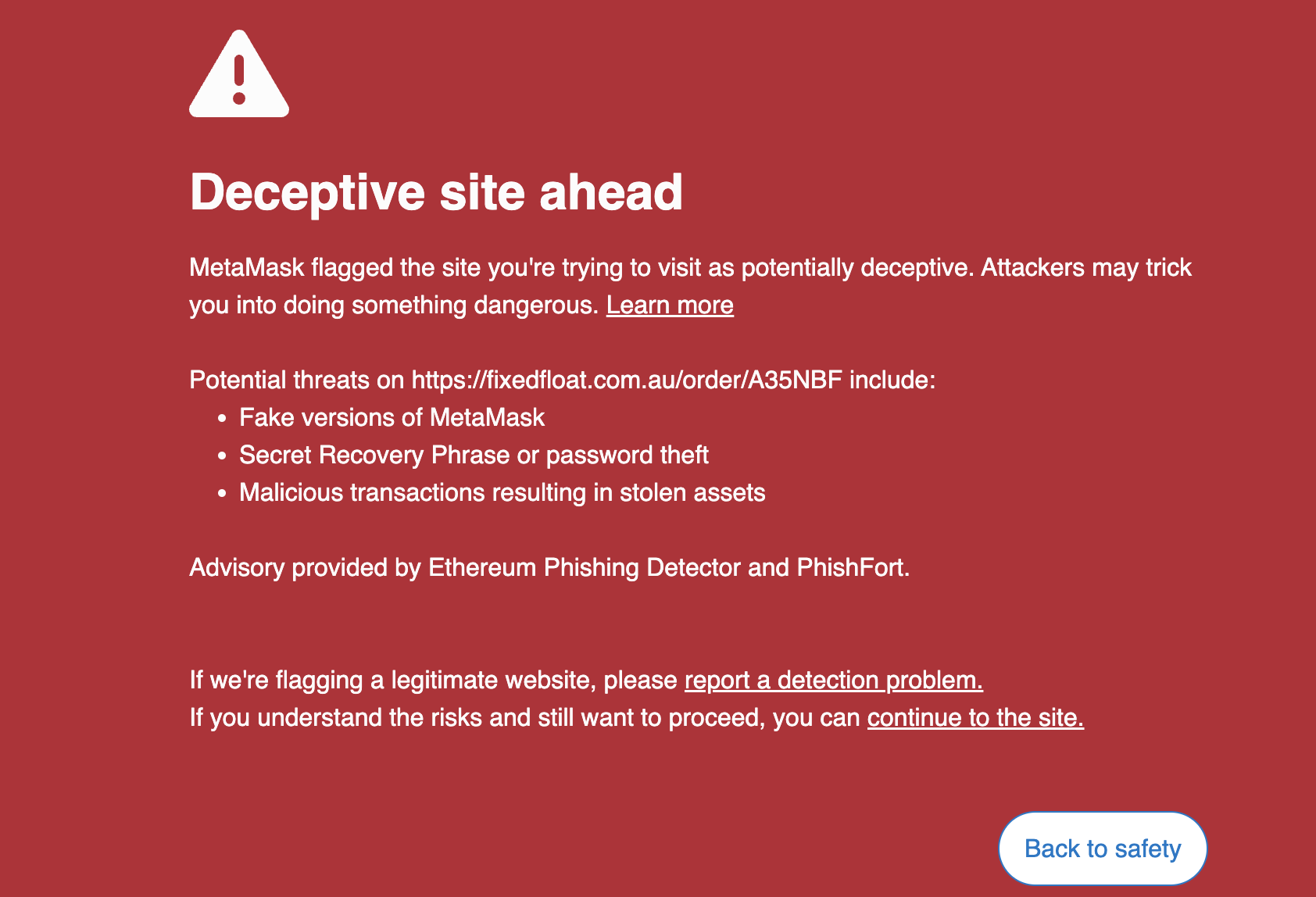 mne to metamask ukazuje ako potencionalny scam.. vyzera to tak ze si sa nechal nachytat na podvodnu stranku :/ original je totiz https://fixedfloat.com bez .au na konci