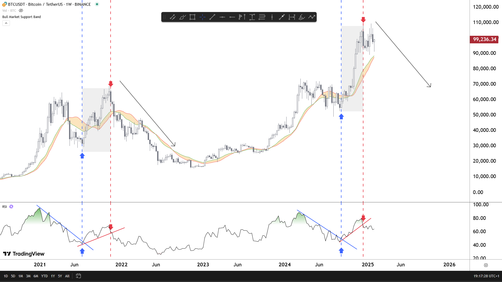 Minuly cyklus kratko po prepade RSI pod cervenu trendline sa trh otocil smer bearmarket.