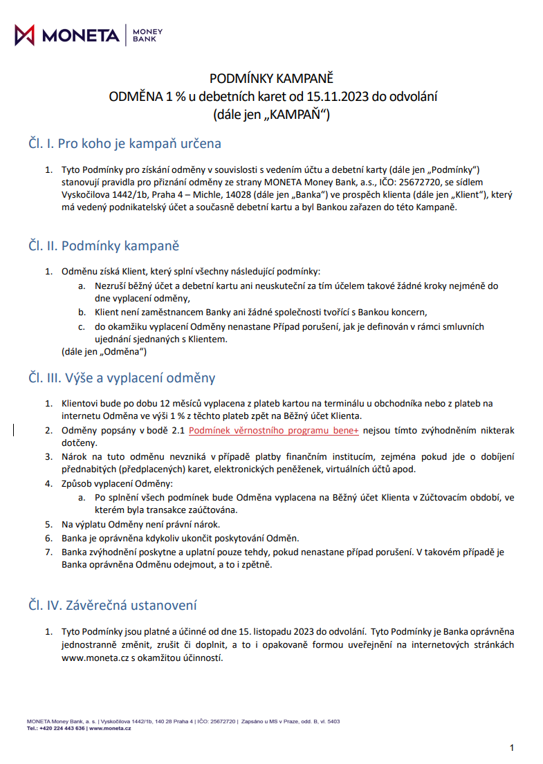 Moneta nově 1% odměna za všech plateb (+ pár vybraných obchodníků ještě více) i na DEBETNÍ kartě, ale taky jen podnikatelské (do teď to měla na kreditky, takže řešit bonitu, úvěrový rámec a podobně, to mohlo být někomu nepříjemné, teď už je to na kartě k běžnému účtu bez dluhu, jen teda nutnost mít ičo)