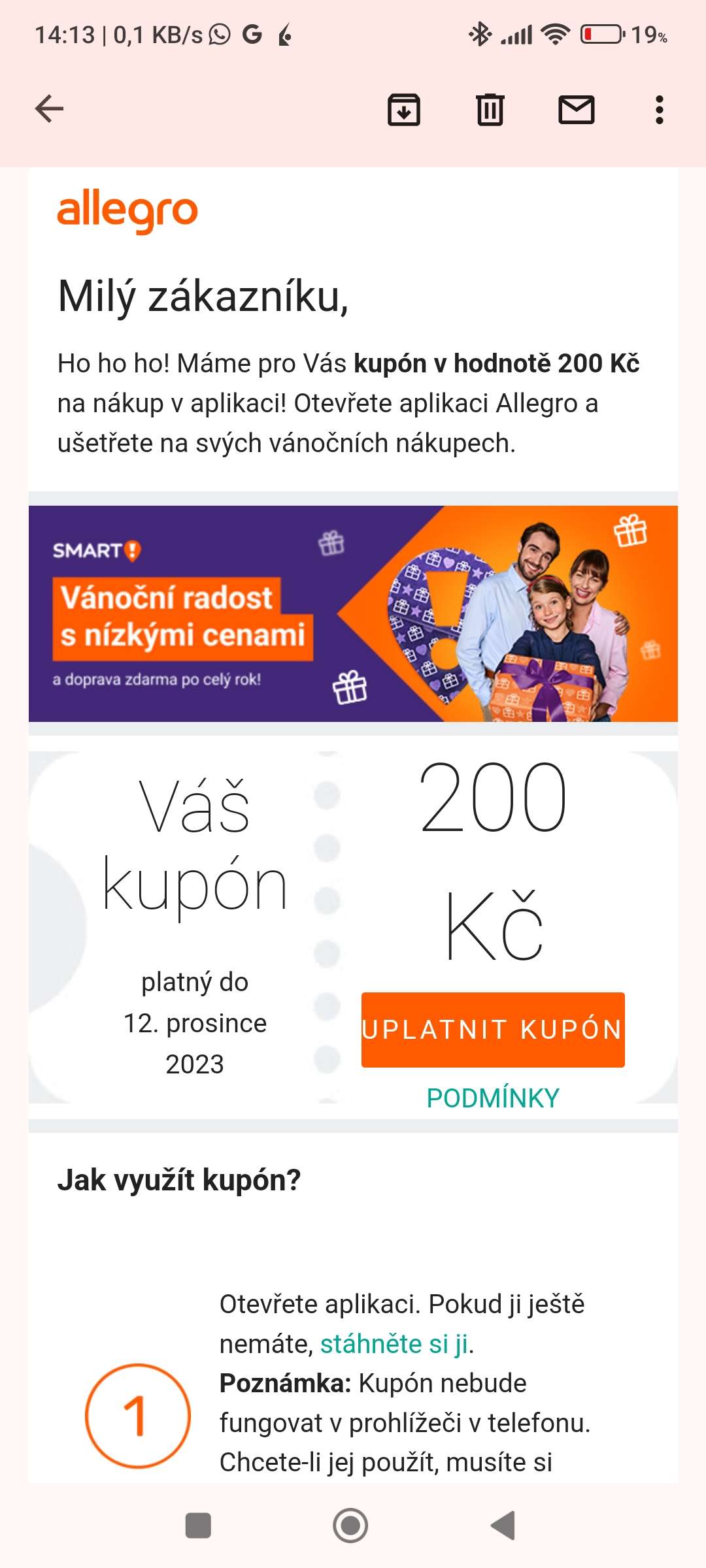 Allegro další kupon v mailu, ale zas na jiném účtu, kde není aktivován placený smart ... 500 kč při nákupu nad 2500 ... zkontroluj si multiúčty <@831379731734855720>