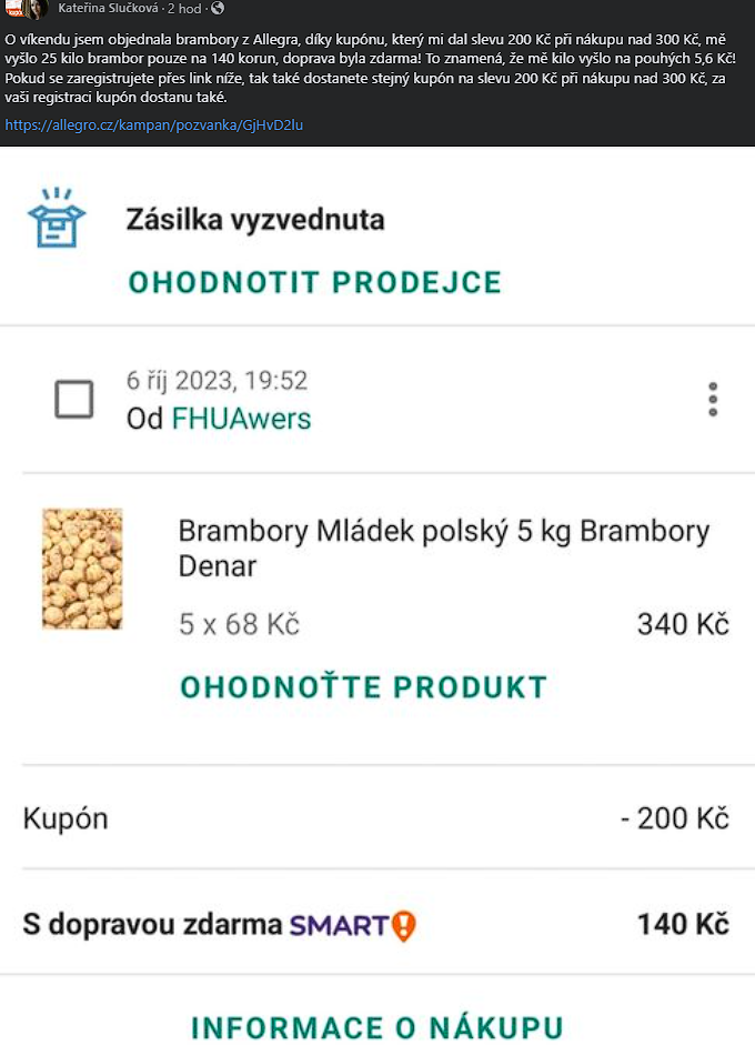 Allegro.cz 200 Kč za registraci nového uživatelského účtu + se registrujte ZDARMA do programu Allegro Smart, získáte tak 5 doručení zdarma (299 Kč - pro doručení do výdejních míst míst nad 499 Kč - pro doručení domů. https://allegro.cz/ (ve soukr. zprávě můžu poslat ještě můj referal odkaz, pokud budete mít zájem podpořit)