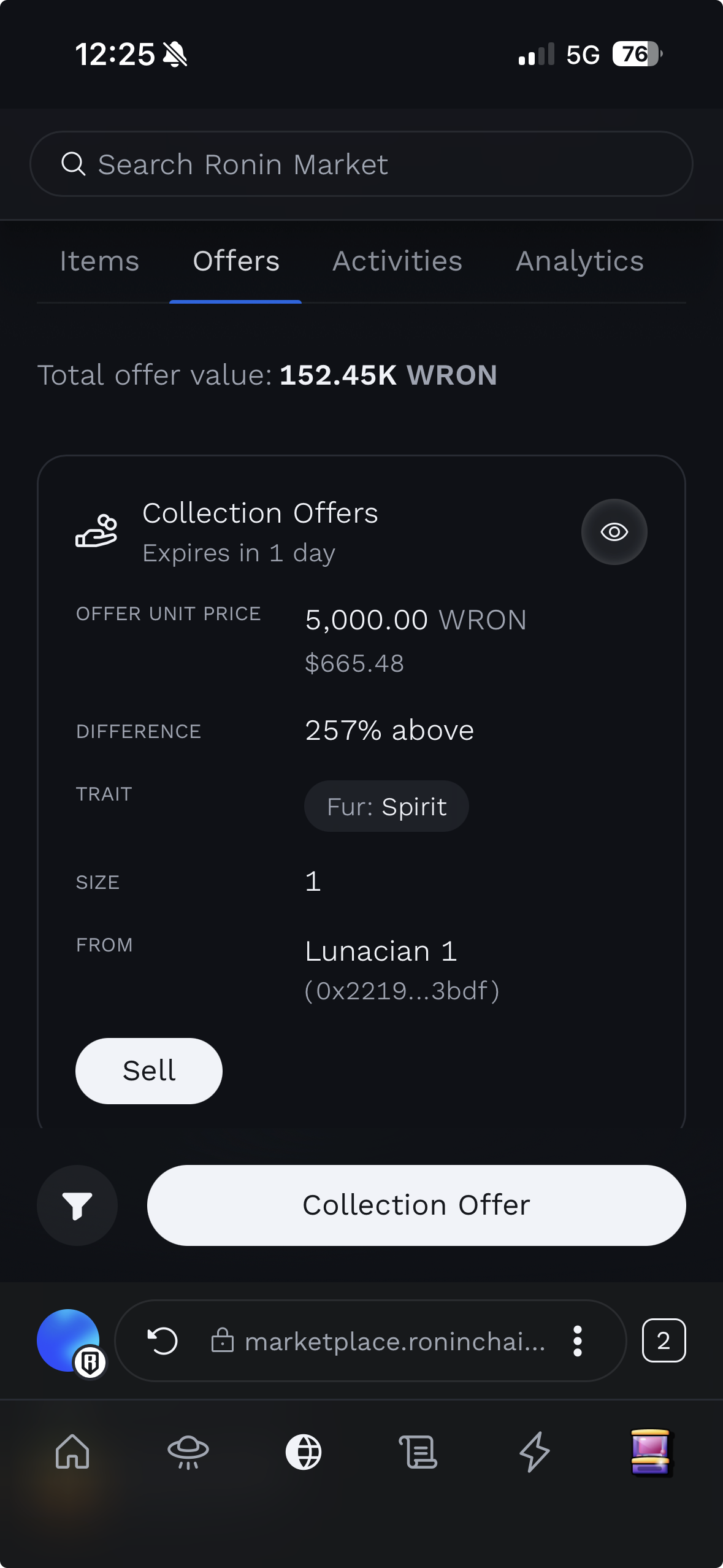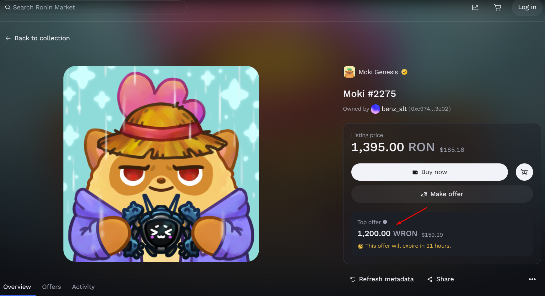 Ano, protože to někdo nabídl tady https://marketplace.roninchain.com/collections/moki-genesis?tab=offers Pokud máš Mokiho, který má Fur: Spirit, můžeš ho hned teď střelit za 5 000 WRON. Až se tahle poptávka uspokojí, bude další nabídka za 3 102 WRON. Nebo ho nabídneš ty, za kolik chceš, a budeš čekat. Proto jsem se ptal, kolik tam máš ty napsáno Top offer (aniž bys ho musel mít nahozený k prodeji).