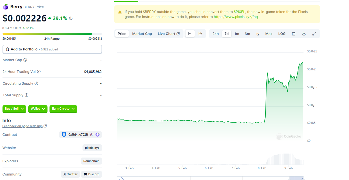 jde koupit BERRY na roninu a to vymenit za oixel ve hře v kurzu 7.6175 $PIXEL