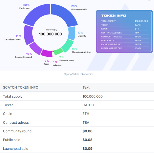 Aktuálně probíhá první kolo $CATCH presalu za 0,06 USD/token. Celkově budou 2 presale kola + launchpady. Ceny jednotlivých kol vidíte na obrázku níže. Co je dobrý, že 43 % celkového supply jde na veřejné předprodeje, tzn. finální inflace nebude tak veliká, protože na staking jde pouze 20 % supply.