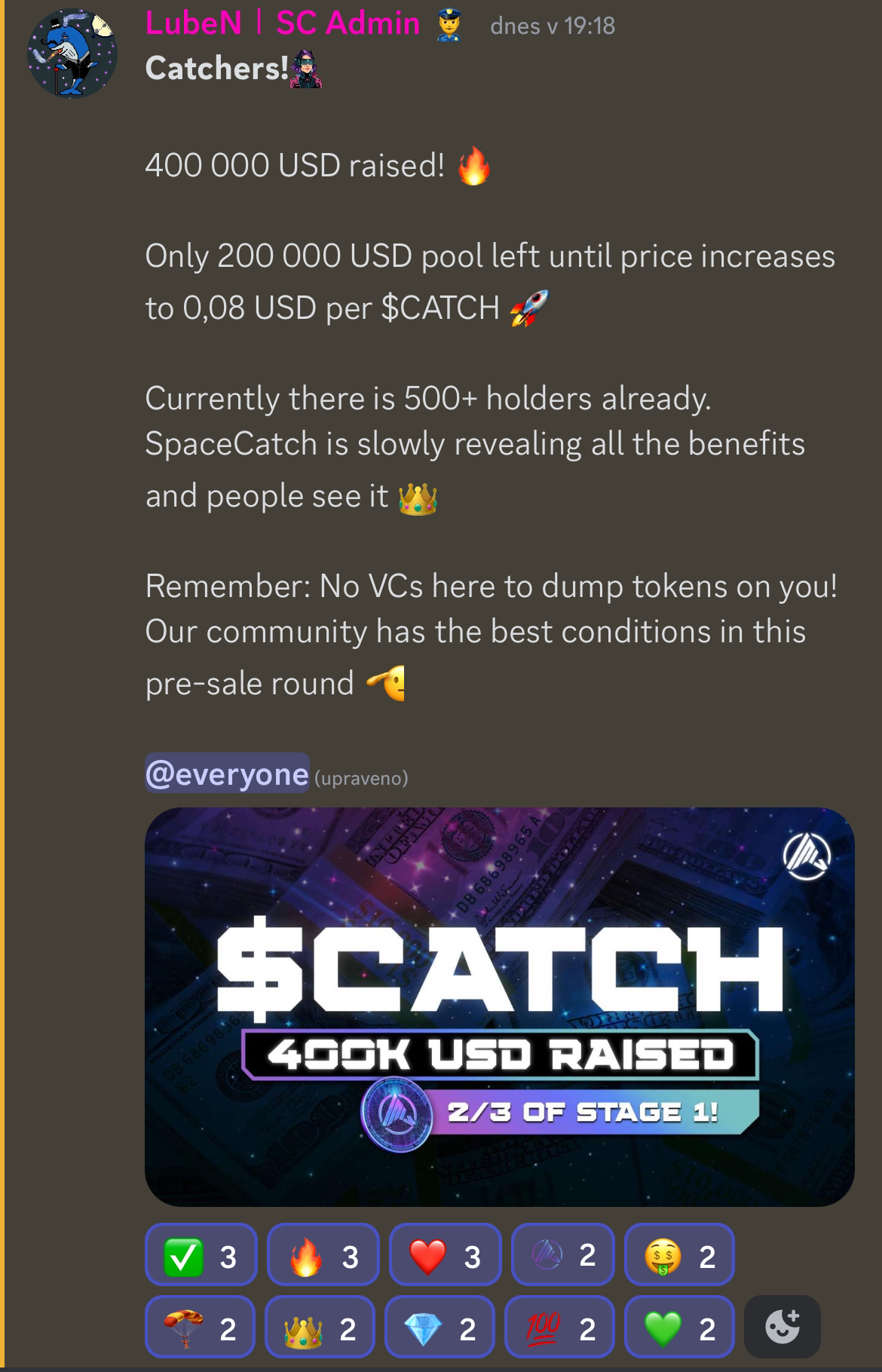 Posledních $35.000 z $600.000! Nakonec žádné dva týdny, ale vyprodá se to asi už dnes. Celkem zabraly ty videa, ale mnoho dalších má tým v kapse, jen ta cena bude o trochu vyšší ($0,08 za $CATCH). Kdo by chtěl za původní cenu, tak refferal hýr: https://spacecatch.io/?ref=AFJyHm7H