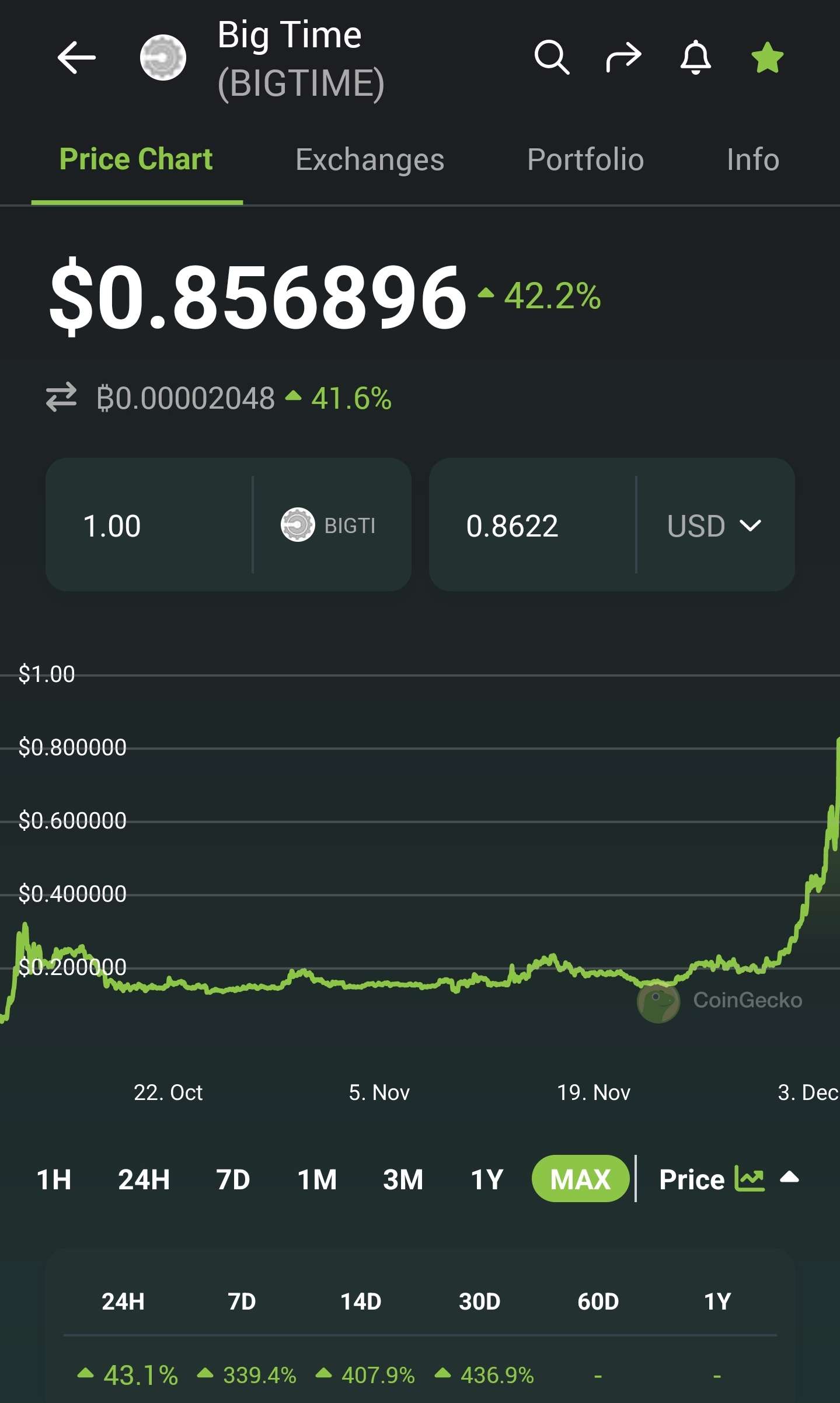 Jinak Bigtime token ted jede bomby. Jestli se nekdo inspiroval tokenama v mem portfoliu, tak ma ted zarobeno. Myria, Bigtime, Ron a gswif ten ma zatim nejmensi market cap