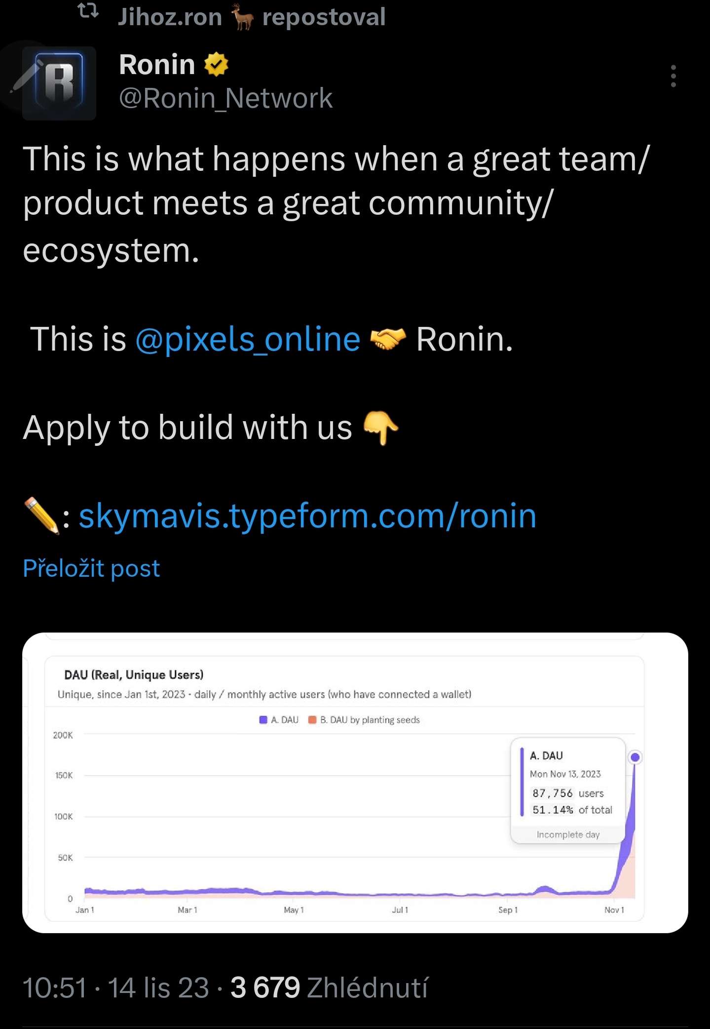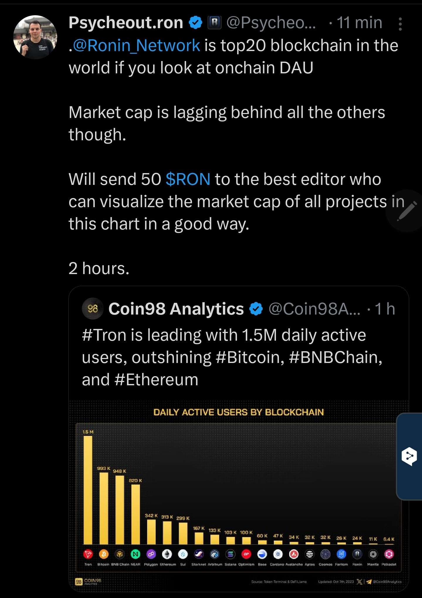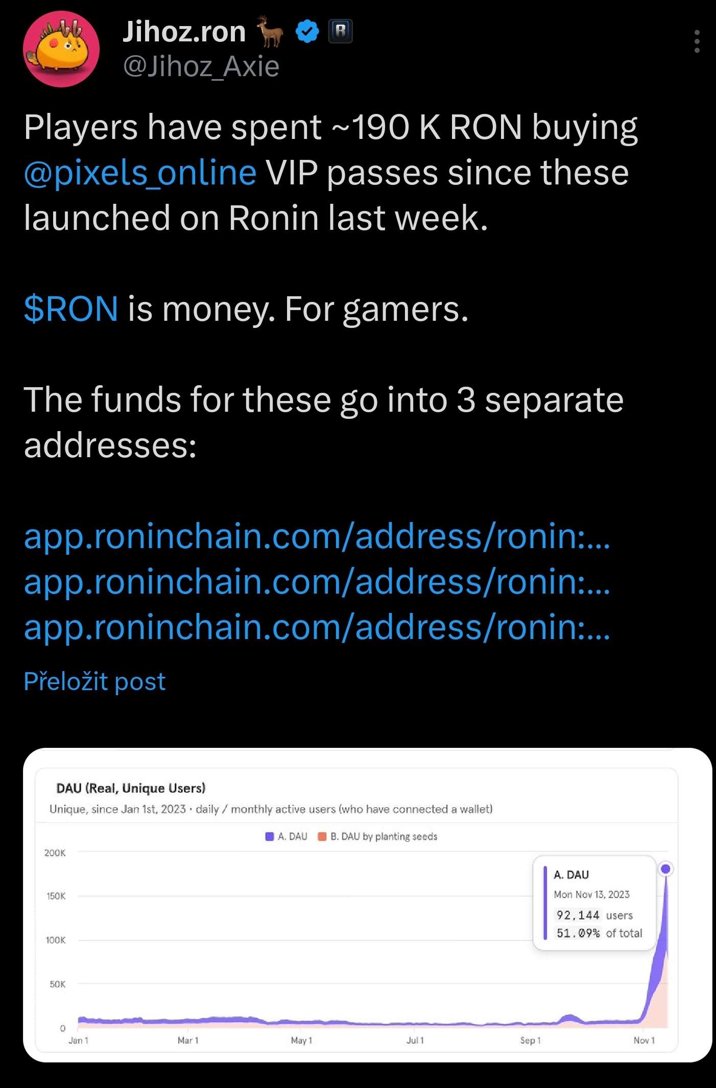 https://twitter.com/Psycheout86/status/1721796495685406892?s=19 Ronin je v top 20 blockchain co se týče DAU.