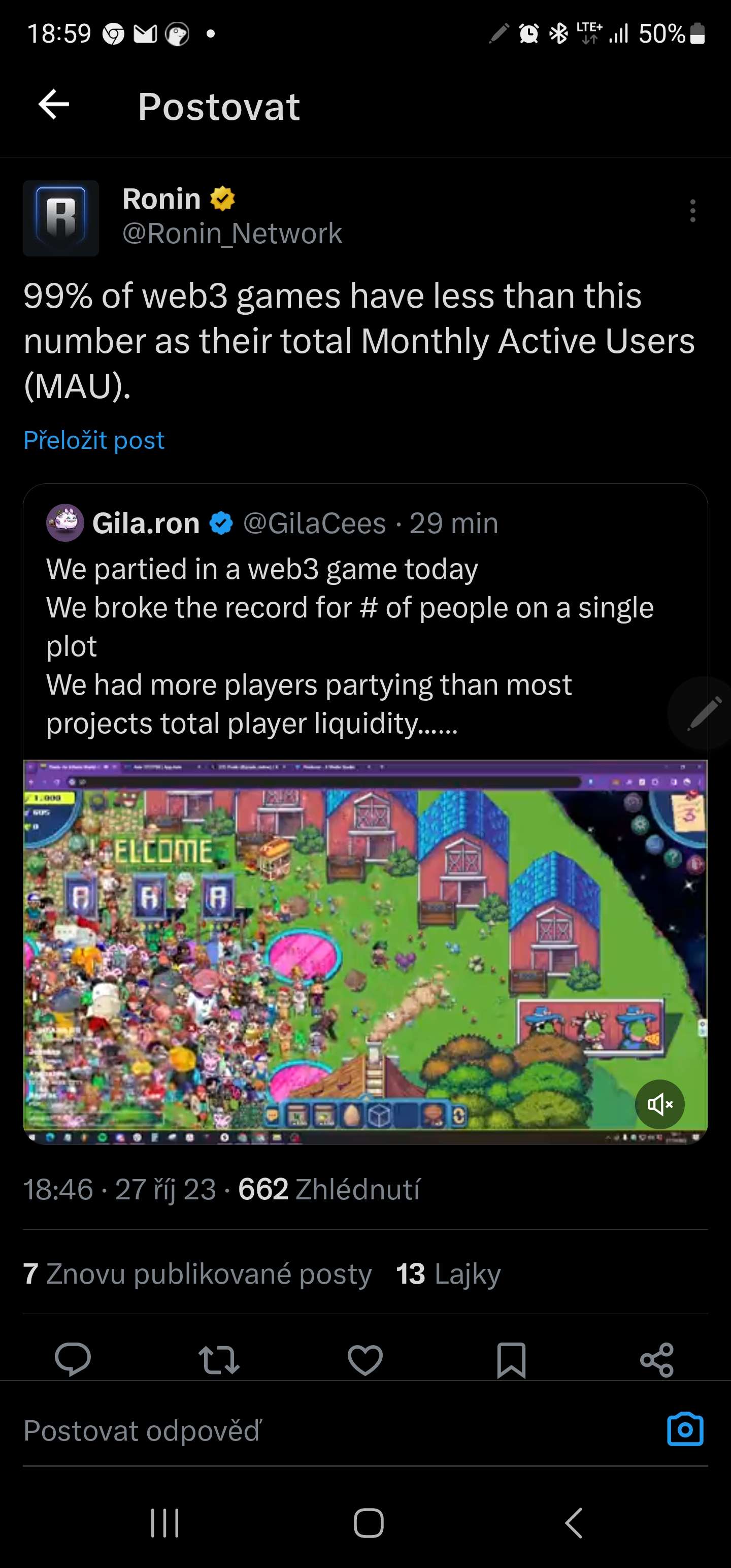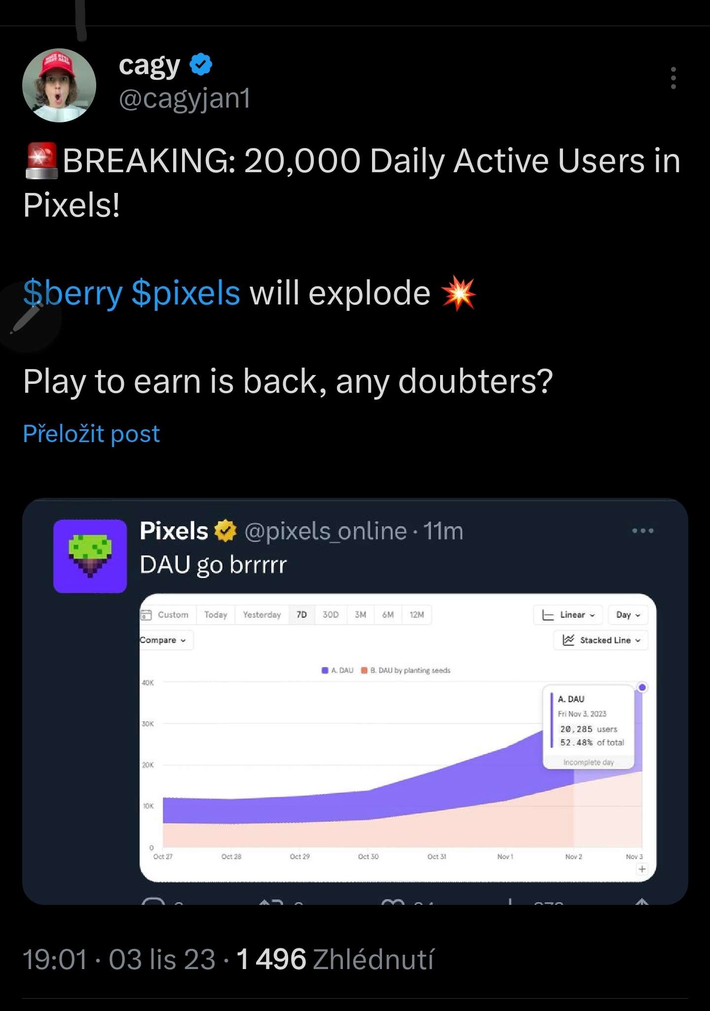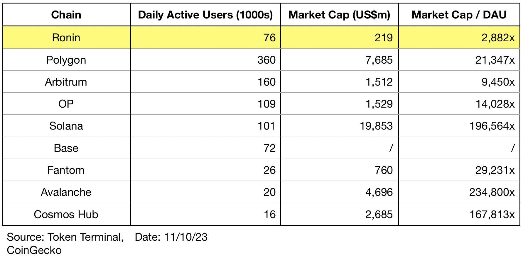 https://twitter.com/Psycheout86/status/1721796495685406892?s=19 Ronin je v top 20 blockchain co se týče DAU.
