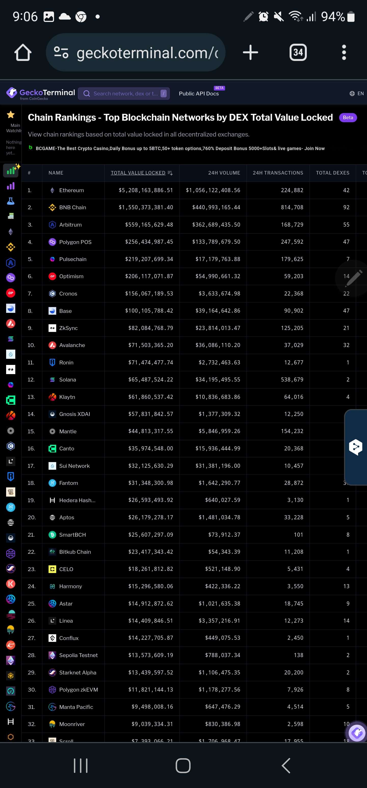 Zde řebříček - Nejlepší blockchainové sítě podle celkové hodnoty uzamčené DEX