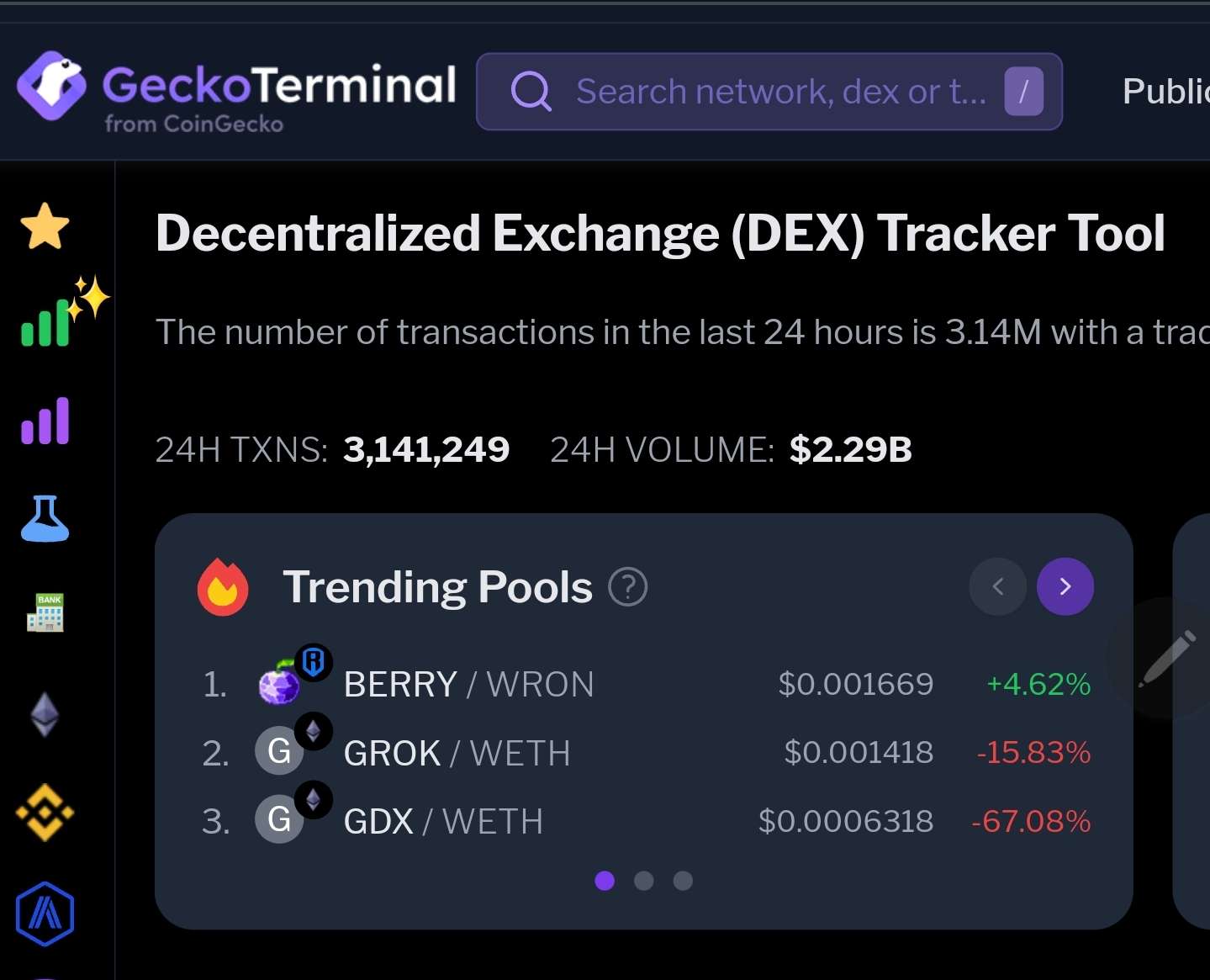 Ronin je zde 11 s $71,504,567.18 je před Solanou i Avalanchem. Vidíme, ze i nejvic trenduje pool WRON/BERRY.(Pixels)