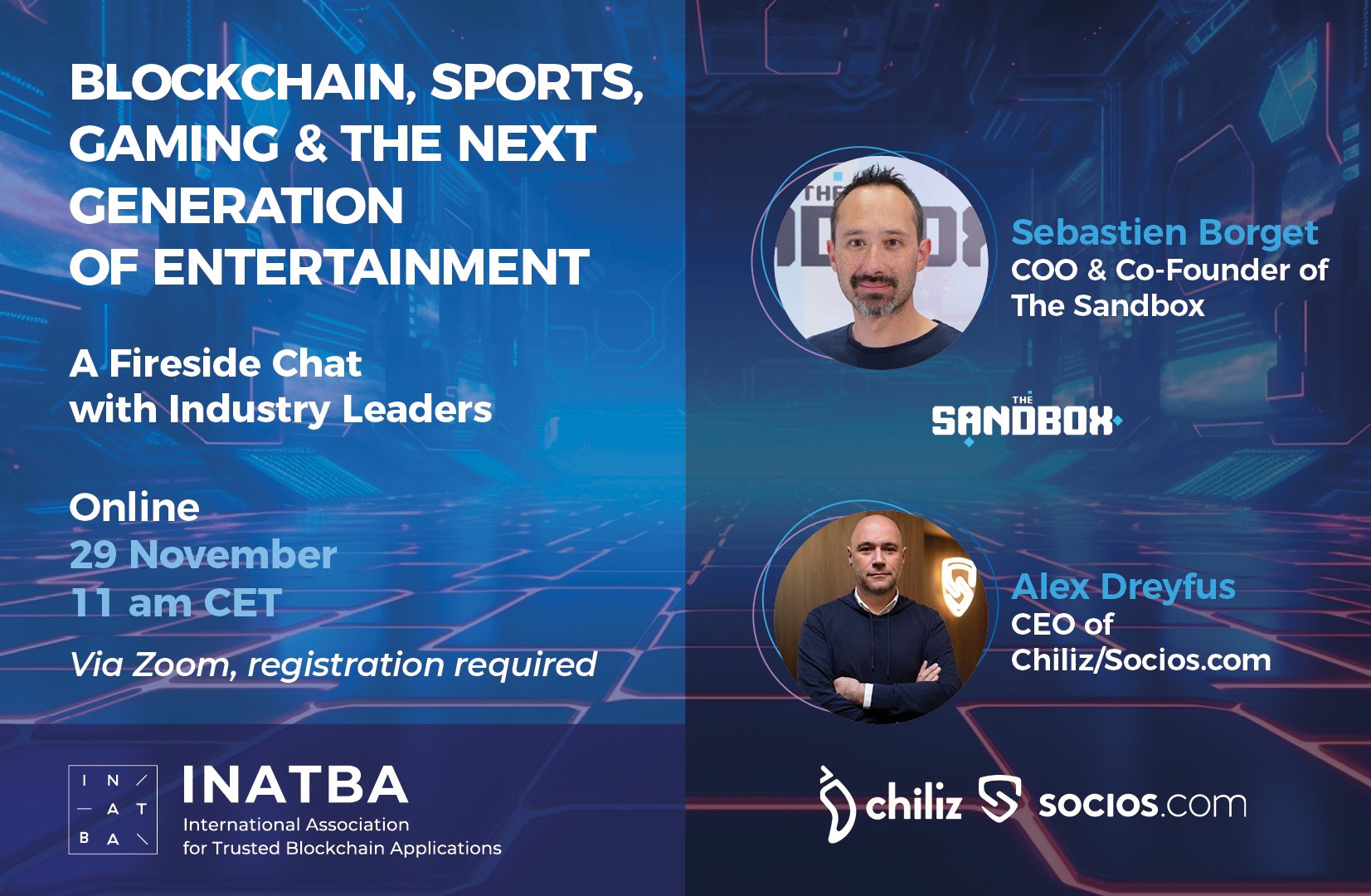 Fireside chat typku ze Sandbox, Chiliz & Socios 29.11. - dejte si to kalendare https://inatba.org/events/blockchain-sports-gaming-and-the-next-generation-of-entertainment-a-fireside-chat-with-industry-leaders/