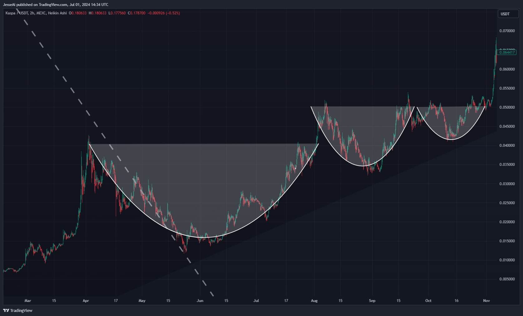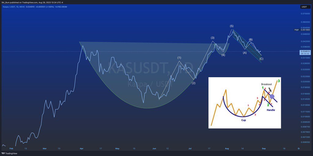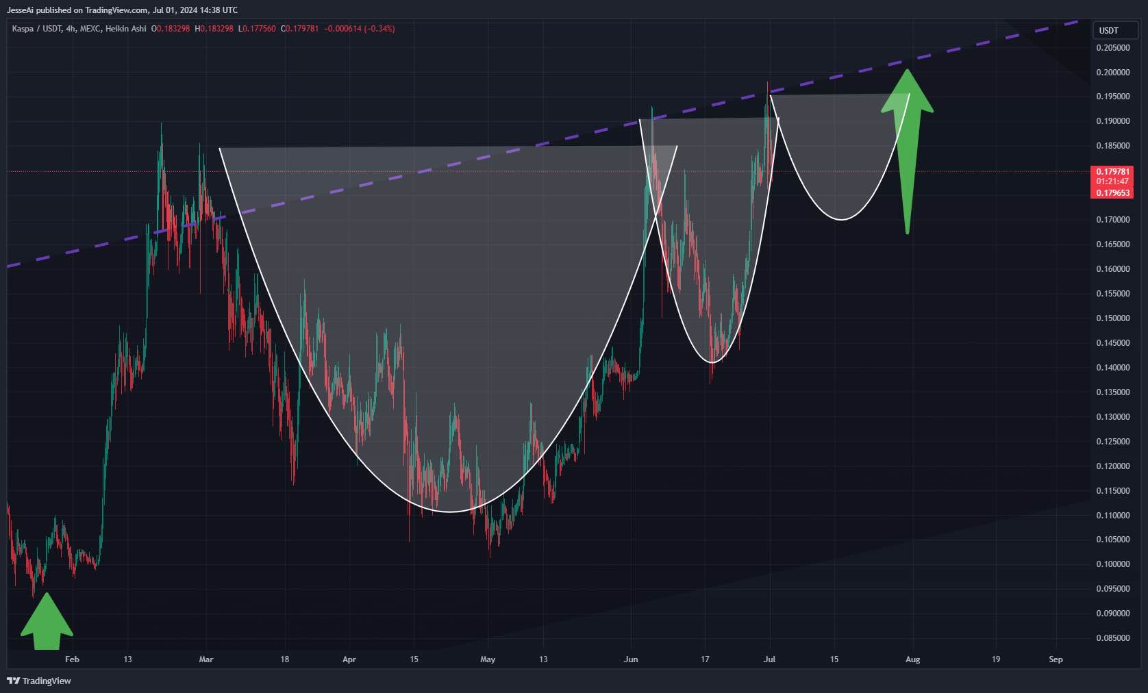 Takeaways from the prior triple cup pattern: The depth of the third cup was 50% of the depth of the secondary cup. Projecting this onto today's chart, this puts the target low price at 17 cents. Notably, given the bullish undertones surrounding Kaspa, the 17-cent figure could be adjusted, while the date of July 15th remains valid (see "classic patterns - cup & handle vs double top" for details).