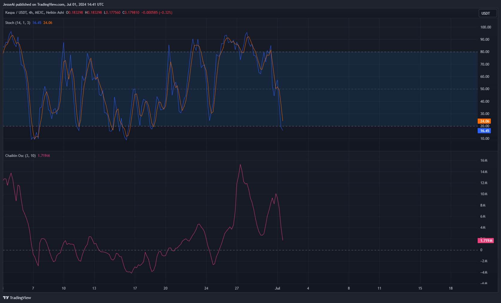 Stochastics: Examining the 4-hour stochastic meters for Kaspa, it appears a mild bear flag oscillation pattern is forming (see "chart patterns - oscillator" for details). This coincides with the triple cup theory. Notably, the "fuel tank" is well above the baseline, indicating underlying strength in the oscillators. In conclusion price to move sideways/bearish until the