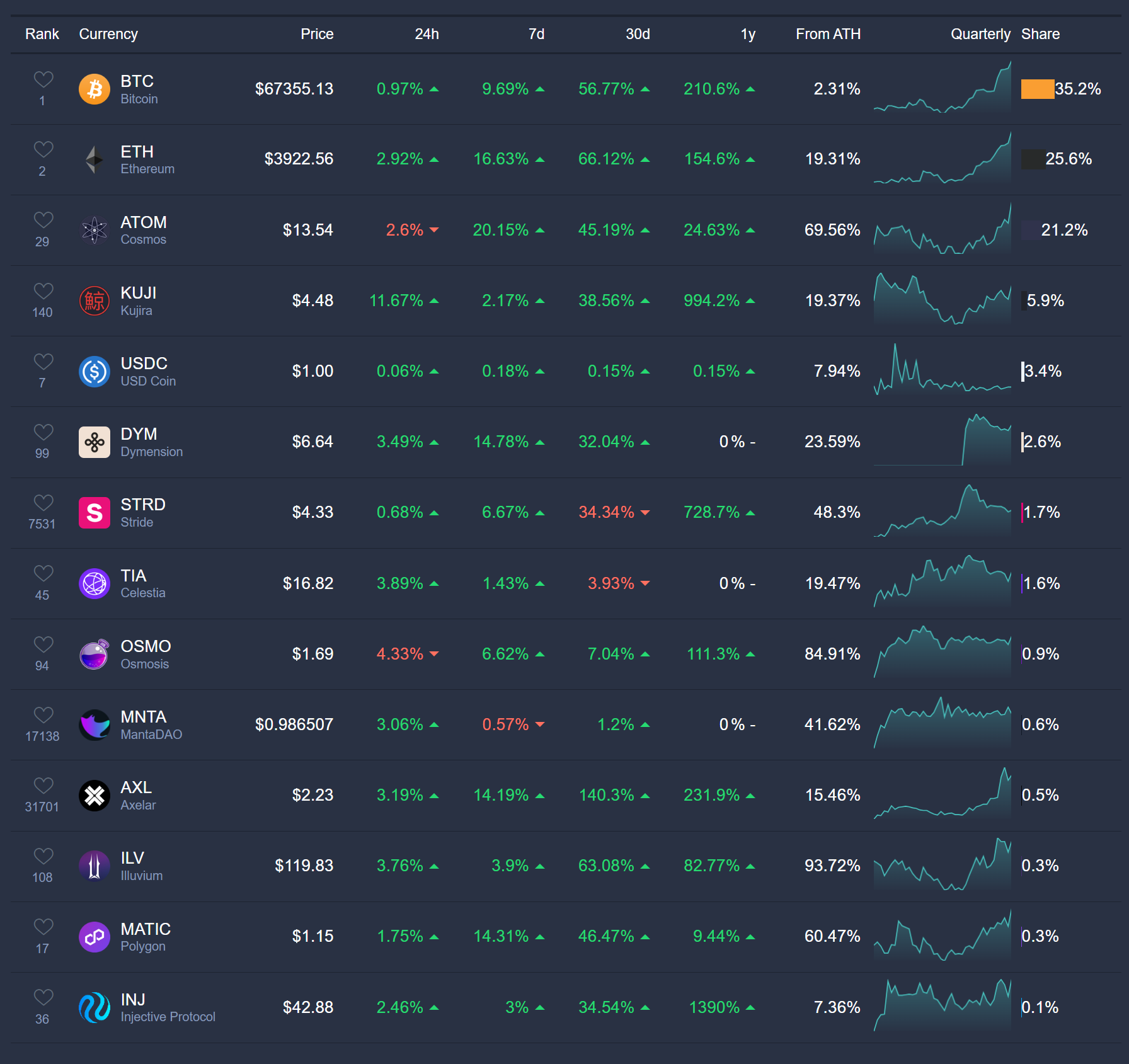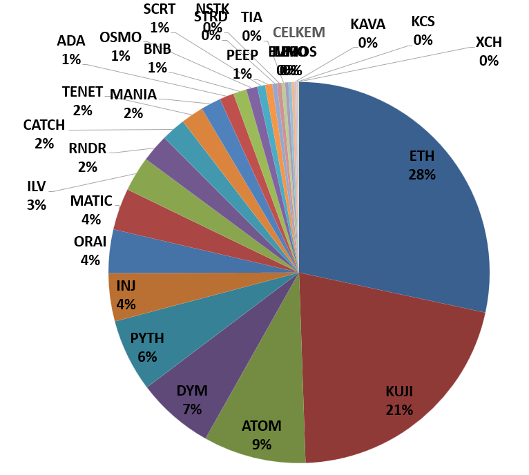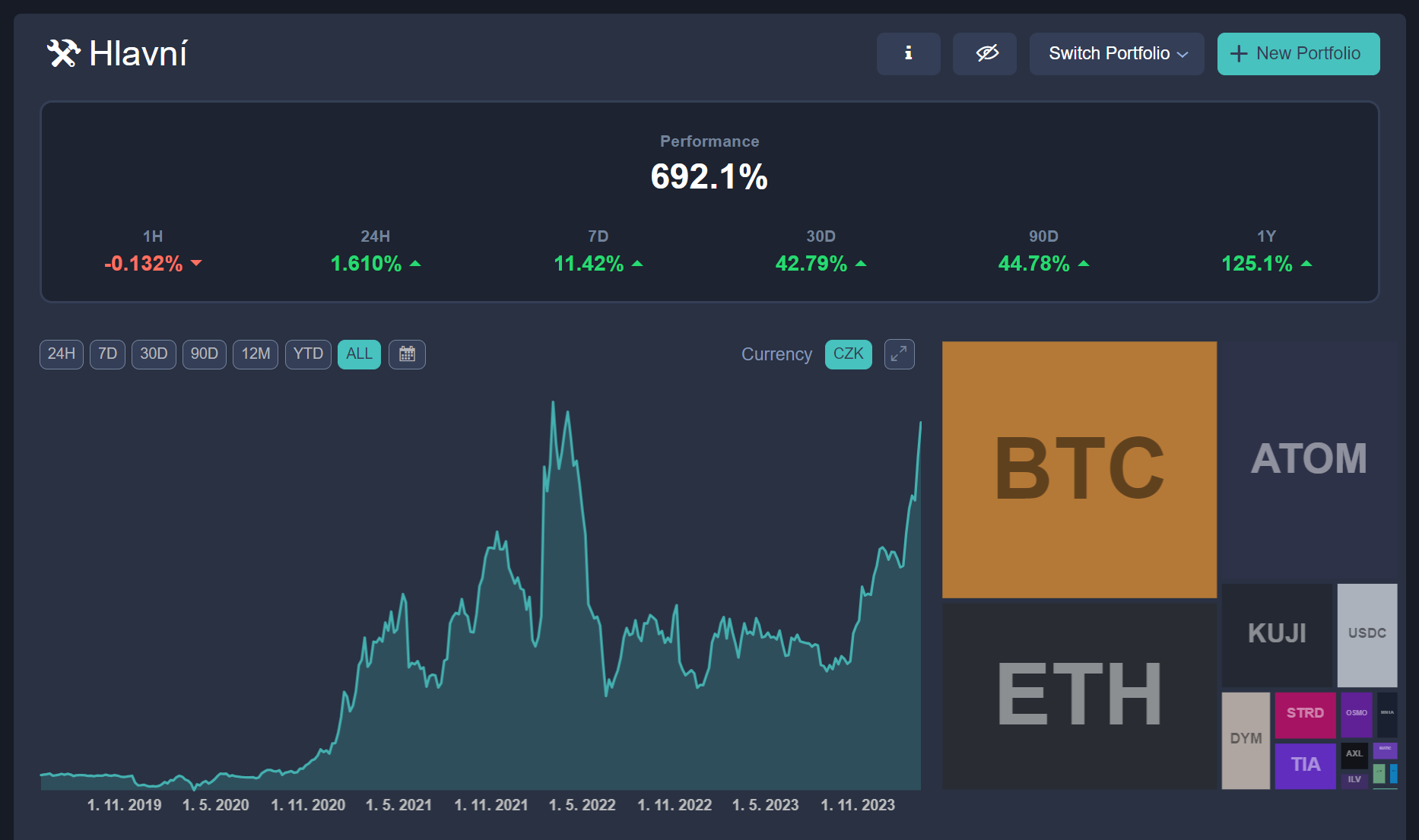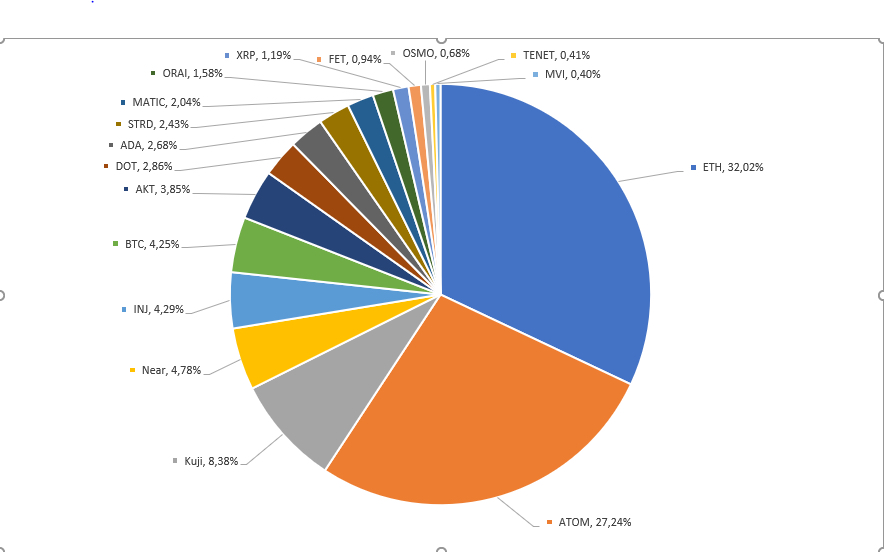 no na můj vkus toho mám moc, ale jsem zevl a nerad se v tom moc rejpu, vyplňuju přiblblý tabulky. Krypto je okrajová záležitost, mohl bych z toho vytřískat určo víc(učitseučitsea....), ale nerad čumím do monitoru víc než je zdrávo, dělám v IT a leze mi to na mozek, vyblikanej... V současné době částečně vybírám zisky/běží unstake. Nej performeři BTC, KUJI, STRD, BOOT, INJ, AXL a pár dropů samozřejmě, všichni víme...😉