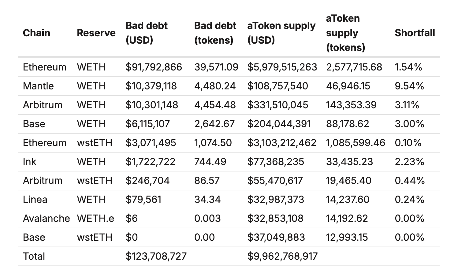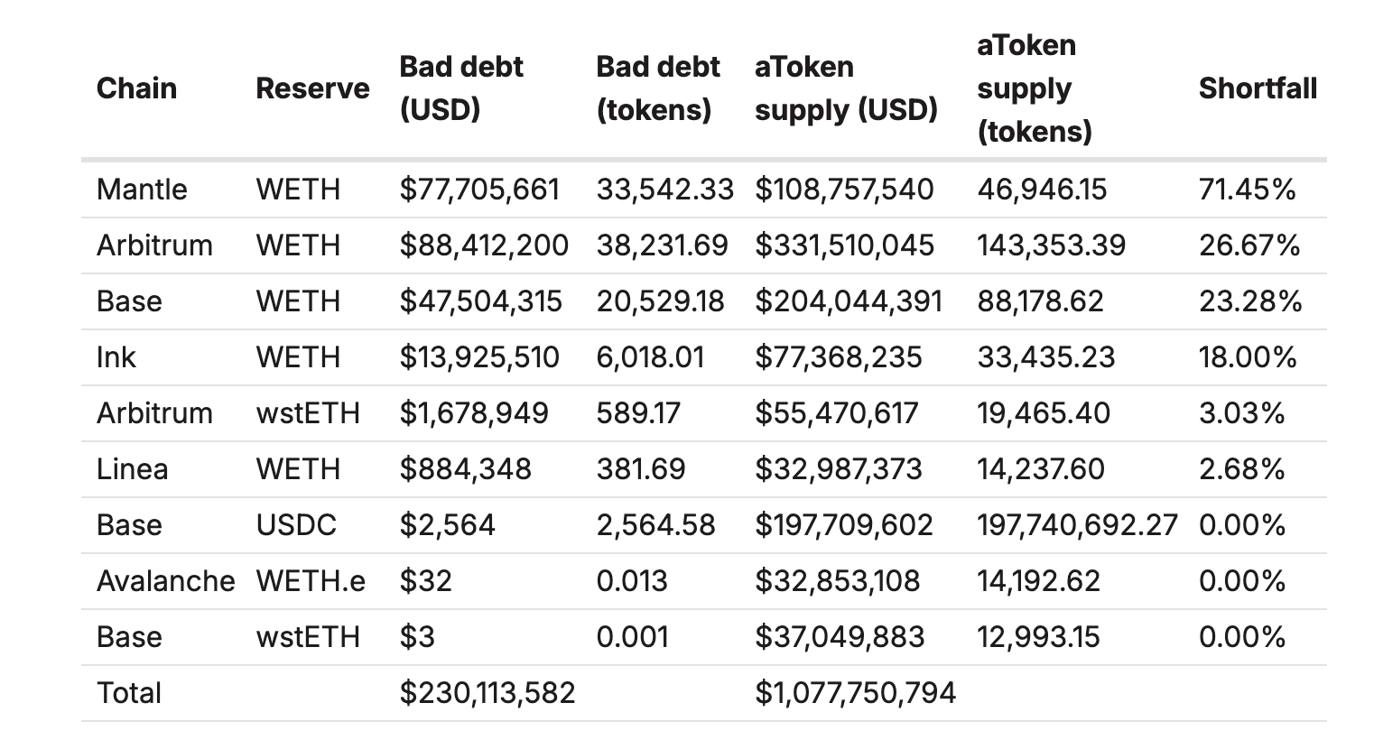 > Nic z toho by nebylo pokryto pomocí Umbrelly, takže by Aave muselo veškeré ztráty pokrýt samo. Mohli by se rozhodnout zachránit některé trhy pomocí své pokladny a půjček, a jiné nechat padnout (Arbitrum, Mantle a Base by byly sítě s největšími ztrátami).