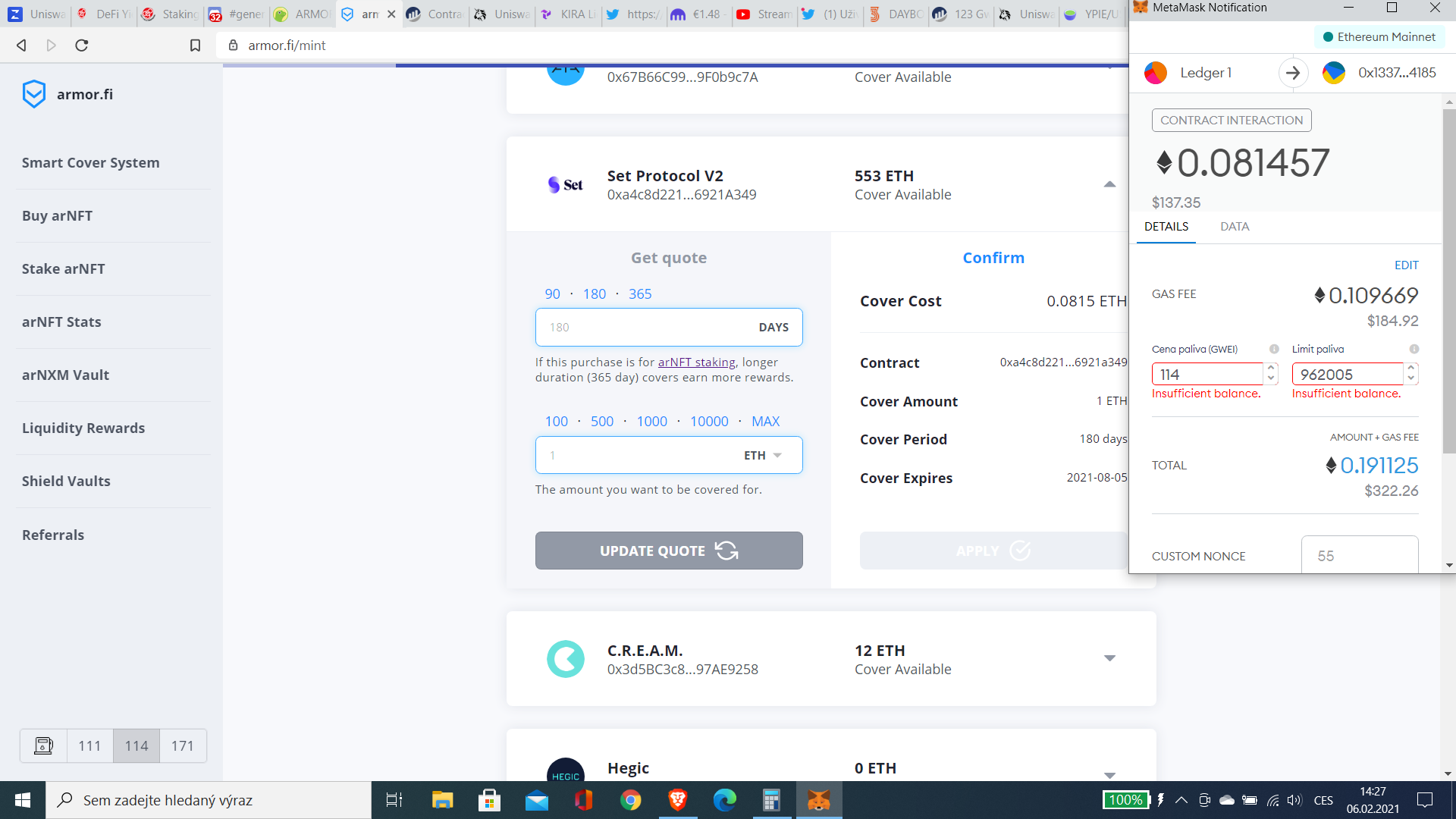 Děkuji Vláďo, jak už jsem psal, porozhlížím se kam se vylejt. Vím že pro mne je jakékoliv v dobré víře doporučení lepší, než můj pocit. Takže si velice rád nechám poradit. Ještě jsem nikdy nic na ETH síti nezasel. Takže... ARMOR? AAVE? RAMP? BADGER? BOND? CC10?