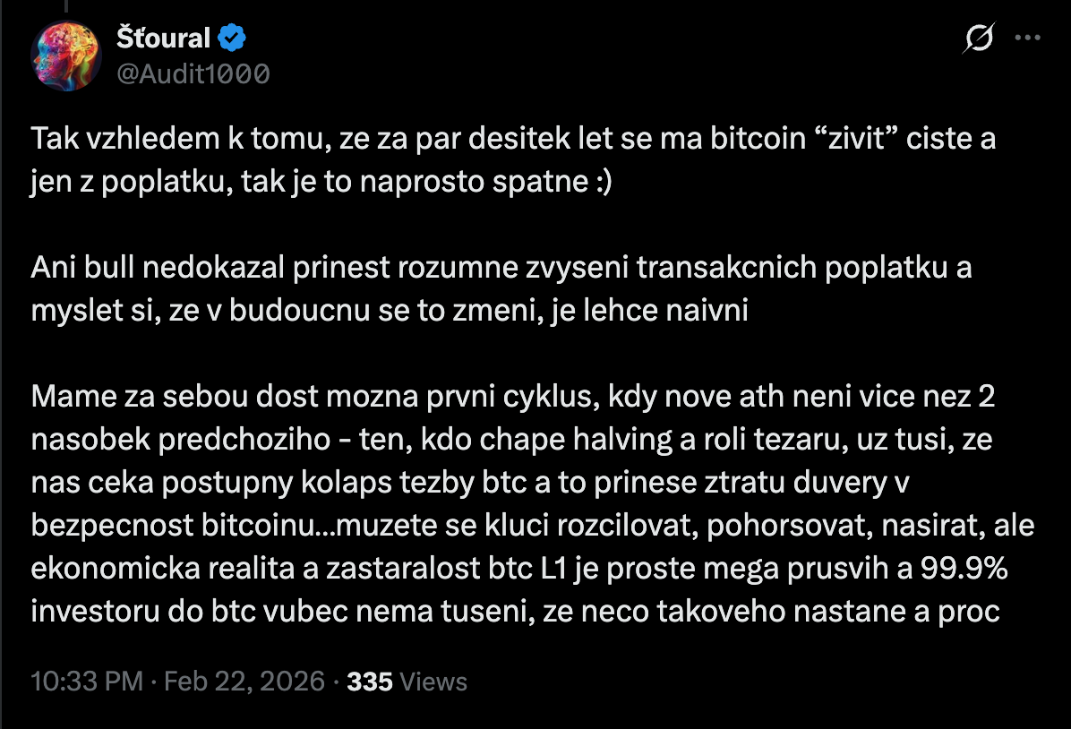 Odpoved na otazku security budgetu resim nekdy od roku 2021 a nikdy jsem nedostal zadnou uspokojivou odpoved, nebo vysvetleni. Bitcoinerskej postoj je zkratka takovej ze se to nejak samo vyresi, .. takhle ale software nefunguje. Cela bitcoinova filozofie je postavena na tom ze bitcoin je "predvidatelnej" a tohle jde naprosto proti tomu. Matematika se meni ve viru. Pro me osobne to byla takova posledni kapka proc verit bitcoinu, a duvod proc jsem se zameril naplno na Ethereum
