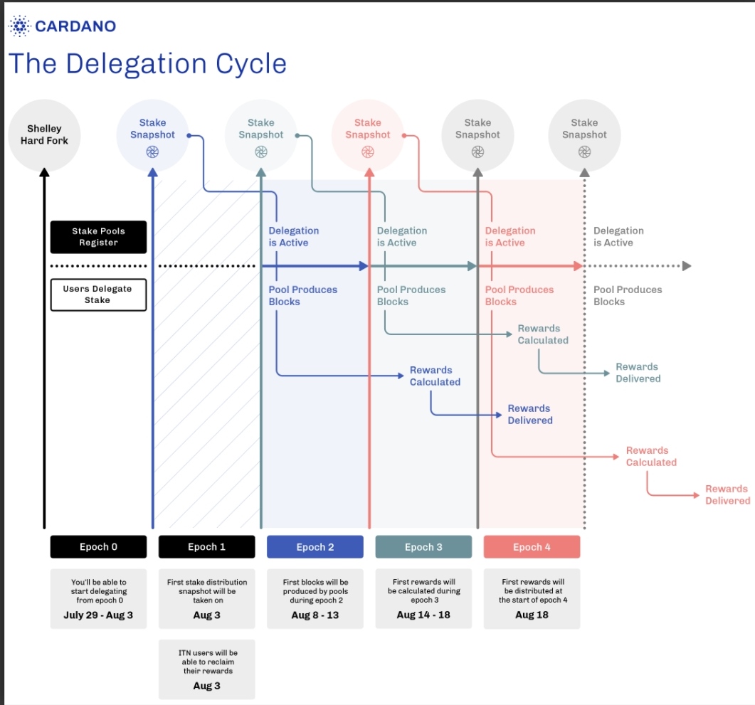 Jednoduché schéma stakingu Cardana. V podstatě je vždy důležitý snapshot na konci epochy a do toho poolu se stake započte. Předelegovat by mělo jít kdykoliv.