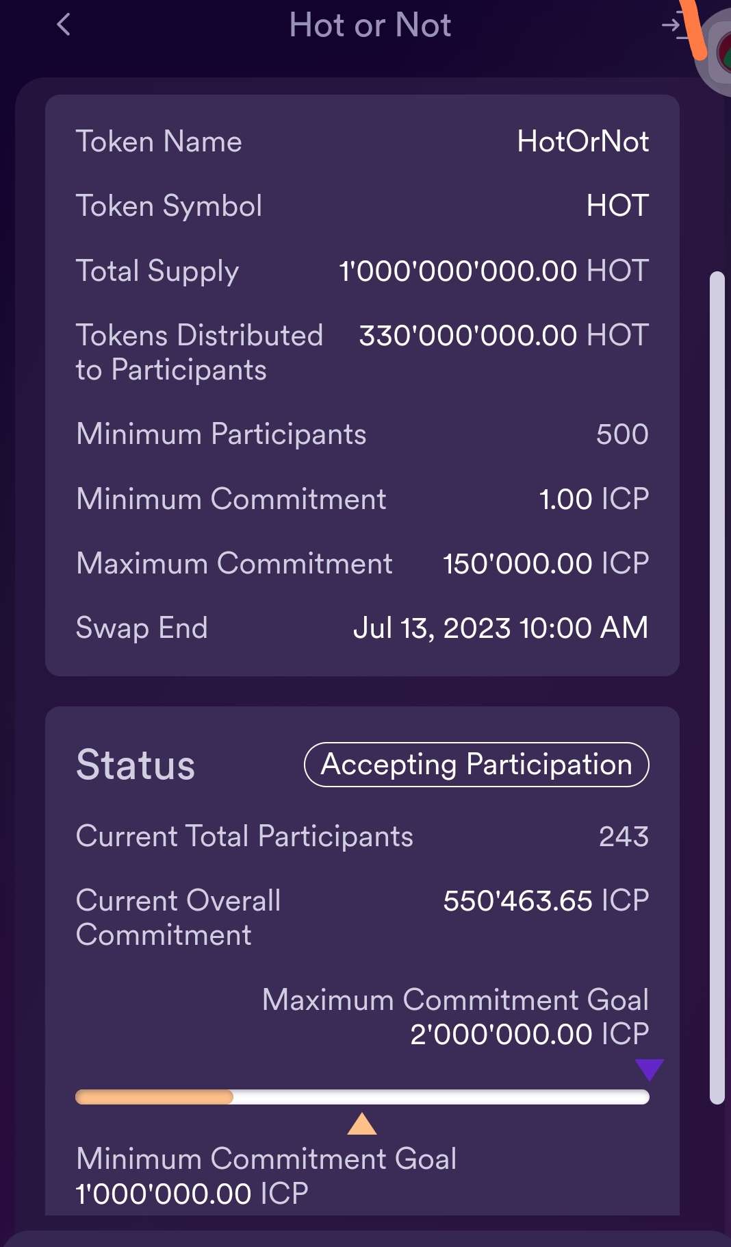 Po polnoci začal predaj (ICO) SNS tokenu (D)aplikácie Hot or Not! Je too doba tiktoku. Cieľ je vyzbierať 1mil ICP. Predaj potrvá 16dni. Osobné budem vstupovať za malú čiastku po prekročení 1mil. Cieľ sú 2mil ICP. Taktiež do 15teho potrvá, možnosť zúčastniť sa Airdropu, s možnými výhodami pre držiteľov NFTs či tokenov SNS1 či CHAT.