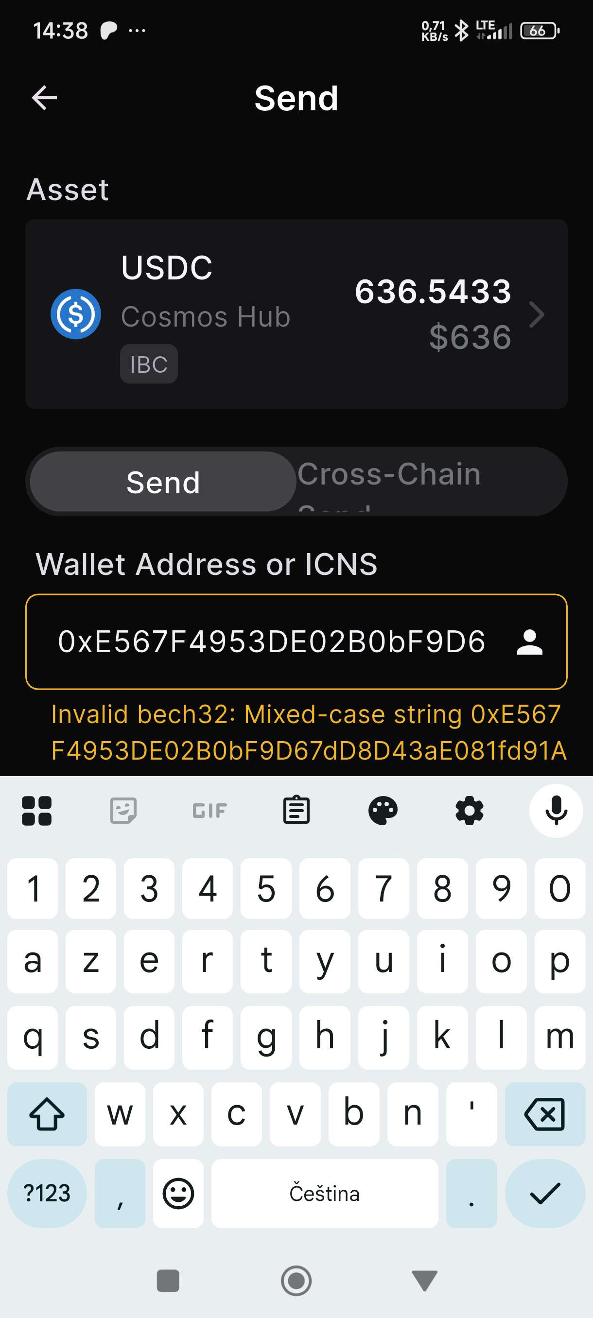 Ahoj marně se snažím z Keplr odeslat USDC. Zkoušel jsem je odeslat na Metamask a po vložení adresy penéženky mi vyskočí hláška/neplatný řetězec32: smíšená malá a velká písmena/Poradi mi někdo co s tím dělat?