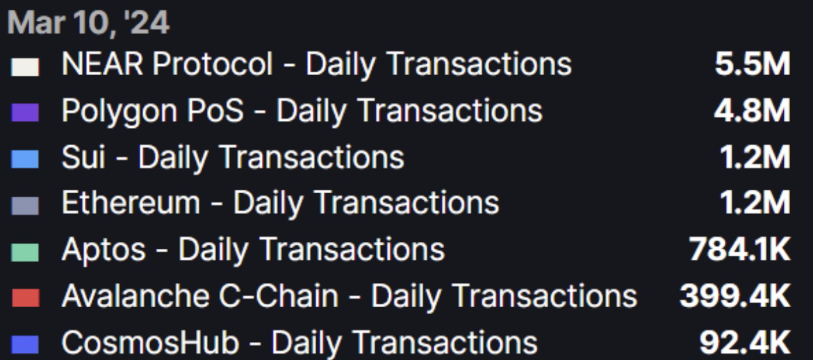 Tohle je tabulka počtu transakcí za poslední den na jednotlivých sítích, jako near slušně dominuje