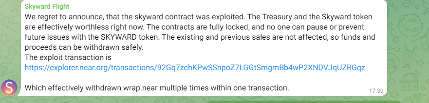 jestli chápu dobře, tak token v prdeli a odepsaný ... aukce fungují dál, ale i tak je to trochu risky ... podle nějakých screenu na twitteru tuším, že útočník přepsal při redeem kontrakty a tak třeba místo xx tisíc sračka tokenu dostal stejné množství nearu atd. a vybral celou pokladnu ... já o divné ceně psal včera večer, na twitteru píšou dnes a jaká je to horká novinka, že hned alarmují team, asi bych měl vylepšit kontakty, abych byl slavný 😄