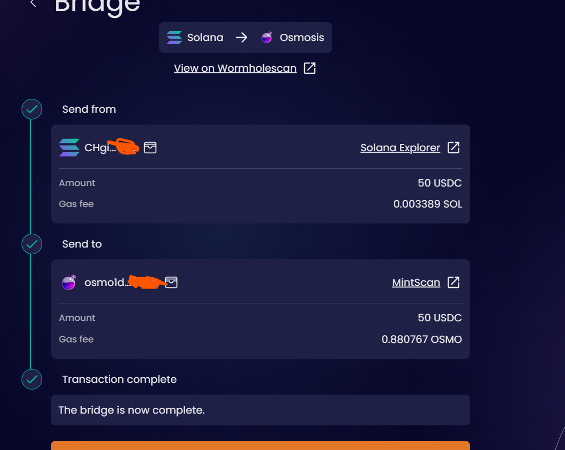 už jsem to vyřešil sám. zadal jsem uplně novou transakci , tentokrát opačně. z osmosis na solanu a na tom bridgi to vidělo, přitom na mintscanu mi to nic neukazovalo, žádných 50 usdc. asi to viselo teda někde v tom bridgi, každopádně kulaťáčky jsou zpět na walletu.